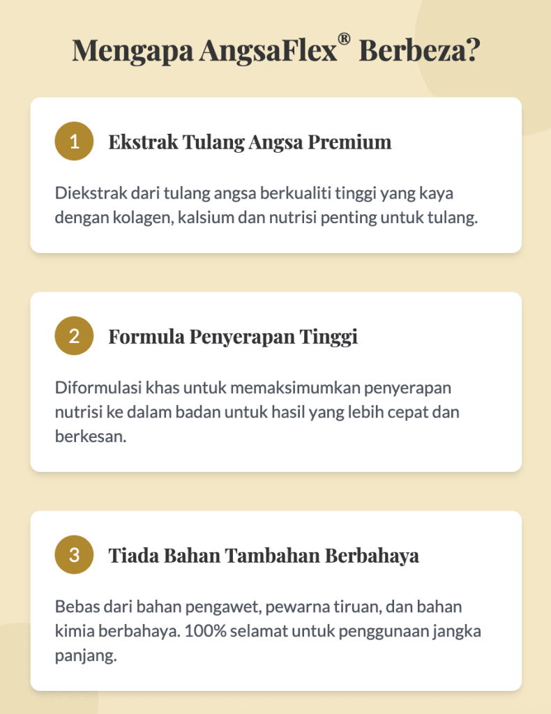 Tak ada bahan kimia keras. AngsaFlex guna bahan semula jadi dari serbuk tulang angsa yang kaya dengan mineral. Selamat untuk penggunaan jangka panjang.